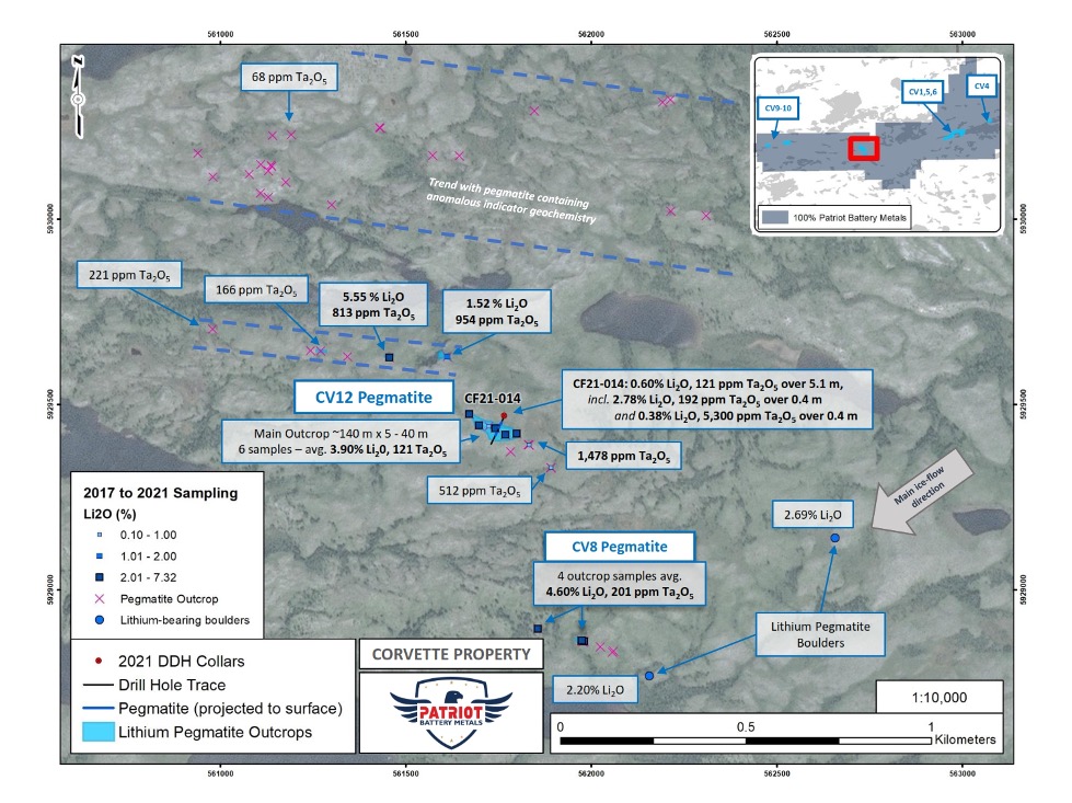 Vancouver, BC, Canada – Patriot Battery Metals Inc. (the “Company” or “Patriot”) (CSE: PMET) (OTCQB: PMETF) (FSE: R9GA) is pleased to announce the results from the 2021 surface exploration program, as well as results for drill hole CF21-014, which targeted a new lithium pegmatite discovery – termed ‘CV12’ – in a new area of the Property, situated approximately 8.5 km west of the CV5-6 pegmatites. Field work was completed during late summer and fall of 2021, on the Company’s flagship and wholly owned Corvette Property (the “Property”), located in the James Bay Region of Quebec, proximal to the regional and all-weather Trans-Taiga Road and powerline infrastructure.