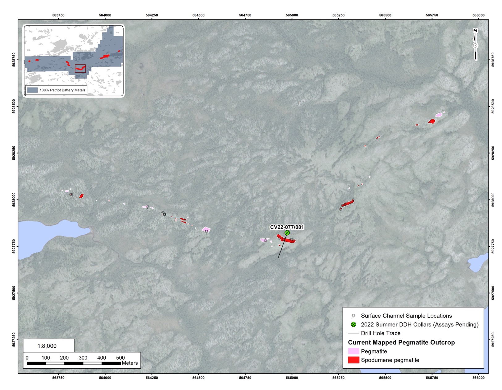 Patriot Battery Metals Inc. (the “Company” or “Patriot”) (TSX-V: PMET) (OTCQB: PMETF) (FSE: R9GA) is pleased to provide an update on the 2022 drill campaign at its wholly owned Corvette Property (the “Property”), located in the James Bay Region of Quebec. The primary drill area is the CV5 pegmatite corridor, located approximately 13.5 km south of the regional and all-weather Trans-Taiga Road and powerline infrastructure with two drills currently coring. The Company has recently positioned the third drill rig at the CV13 pegmatite cluster for initial drill testing.