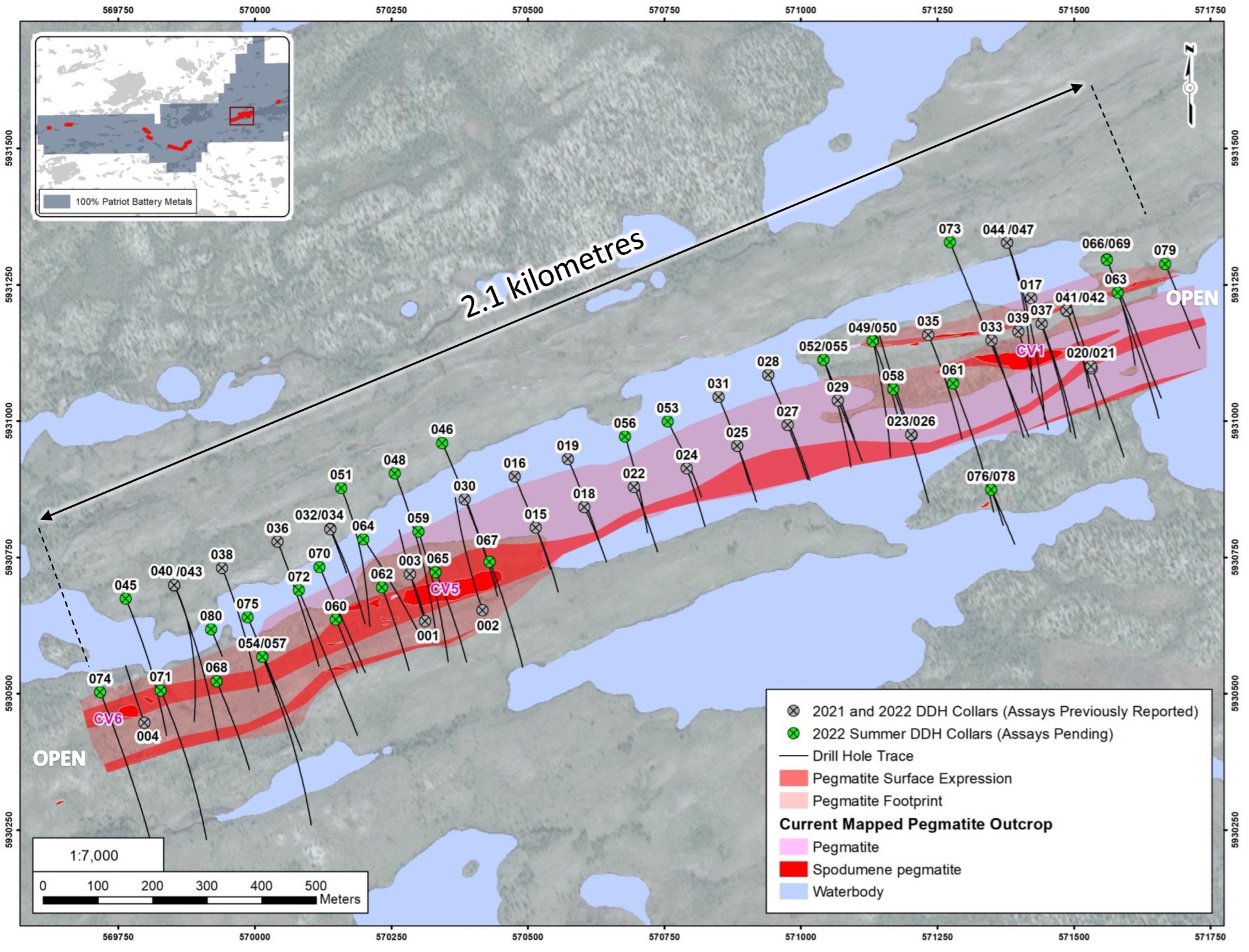 - Spodumene-bearing pegmatite intersections in drill holes CV22-074 and 079 have extended the strike length of mineralized pegmatite at the CV5 corridor further to the west and east, respectively, for a collective mineralized pegmatite strike length of at least 2,100 m and remains open in all directions.