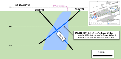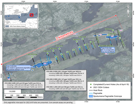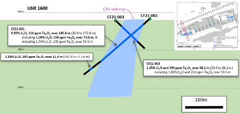 The aggressive 2022 drill campaign is being completed as a direct follow-up to the strong lithium-tantalum mineralization encountered in the first four (4) drill holes to test the CV5-6 pegmatite this past fall. Drill intercept highlights include 155.1 m at 0.94% Li2O and 117 ppm Ta2O5 (CF21-002), and 58.1 m at 1.25% Li2O and 194 ppm Ta2O5 (CF21-003) (see news releases dated January 27th and February 3rd, 2022).