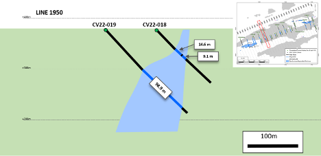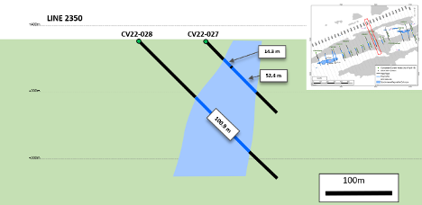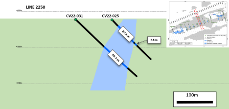 • Spodumene pegmatite has been logged as far down as approximately 265 m vertical depth (CV22-034), with the hole ending in spodumene pegmatite
