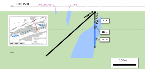 The winter/spring phase of the 2022 drill campaign began in late February with two diamond drill rigs, which remain on site in preparation for the summer/fall phase of the drilling expected to commence in early June. A total of twenty (20) NQ size diamond drill holes (4,345 m) were completed during the winter/spring phase and included seventeen (17) holes collared over ice, and three (3) holes collared over land. The primary objective of the winter/spring drill program was to test for mineralized pegmatite along strike from surface outcrops, potentially connecting the CV5-6 pegmatites with the CV1-2 pegmatites, as well as testing the mineralization at depth. Geological modelling, based on drilling to date, indicates the target pegmatite has a strike length of at least 1,400 m and is widening at depth. All 2022 drill core analysis is pending, although spodumene has been field identified all1 2022 drill holes completed to date.