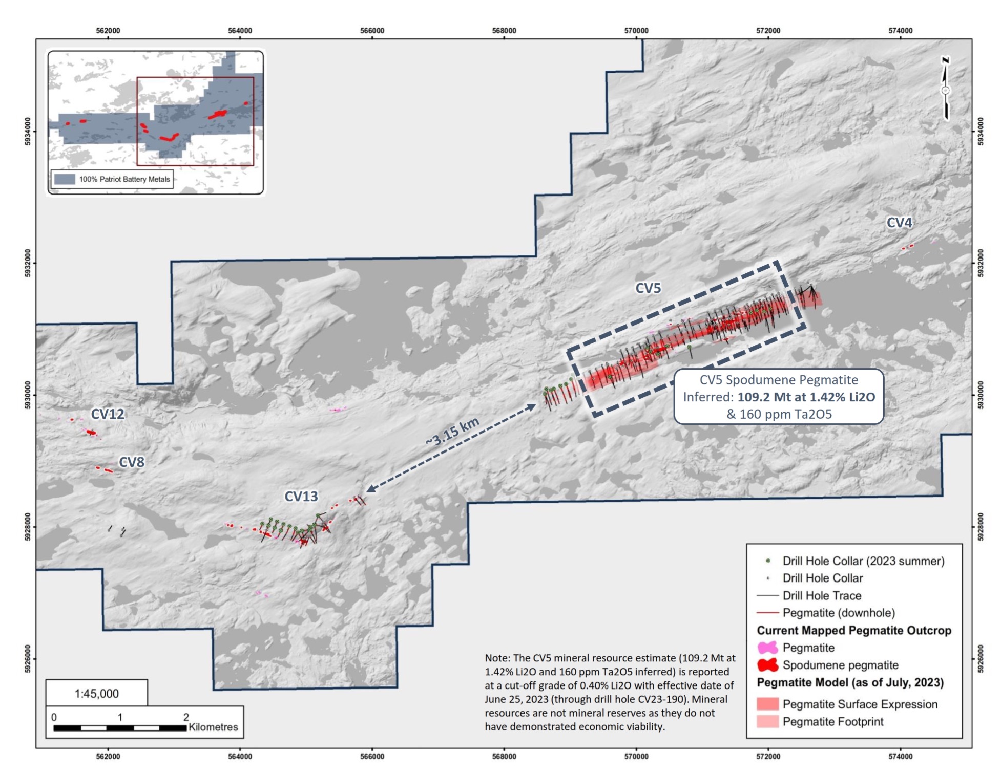 1 The CV5 mineral resource estimate (109.2 Mt at 1.42% Li2O and 160 ppm Ta2O5 inferred) is reported at a cut-off grade of 0.40% Li2O with effective date of June 25, 2023 (through drill hole CV23-190). Mineral resources are not mineral reserves as they do not have demonstrated economic viability.