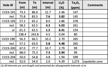 o 10.7 m at 2.79% Li2O (67.0 m to 77.7 m), including 7.3 m at 3.94% Li2O (CV23‑200)