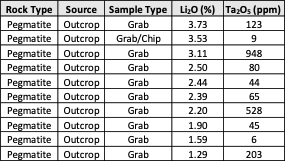 Assay results have been returned for the first series of grab/chip sampling and include a total of thirty-two (32) pegmatite samples collected along the trend grading an average of 0.98% Li2O to maximum of 3.73% Li2O (Table 1). Grades of tantalum average 113 ppm Ta2O5 with a maximum of 948 ppm Ta2O5. Assays from additional grab/chip samples remain pending, as well as assays for a total of 121.1 m of channel sampling completed to provide a more robust estimate of grade potential and zonation across the outcrops.