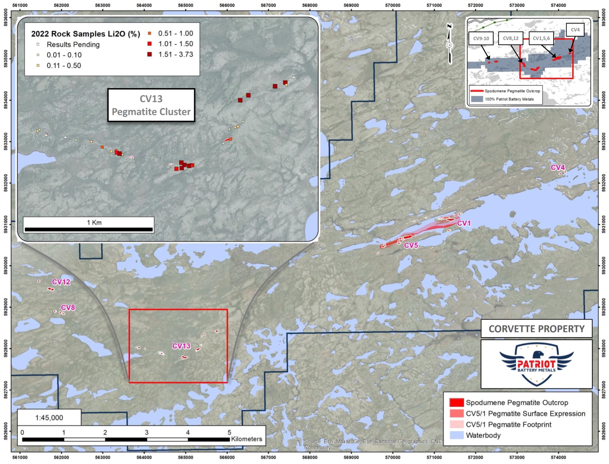 Patriot Battery Metals Inc. (the “Company” or “Patriot”) (TSX-V: PMET) (OTCQB: PMETF) (FSE: R9GA) is pleased to provide an update on the 2022 surface exploration program at the Corvette Property (the ‘Property’) highlighted by the discovery of a new and significant lithium pegmatite cluster (CV13) situated less than 4.5 km from, and on geological trend with, the CV5‑1 pegmatite corridor where drilling is currently focused. The new discovery is located central to the Property and approximately 15 km south of the Trans-Taiga all-weather road and powerline infrastructure corridor.