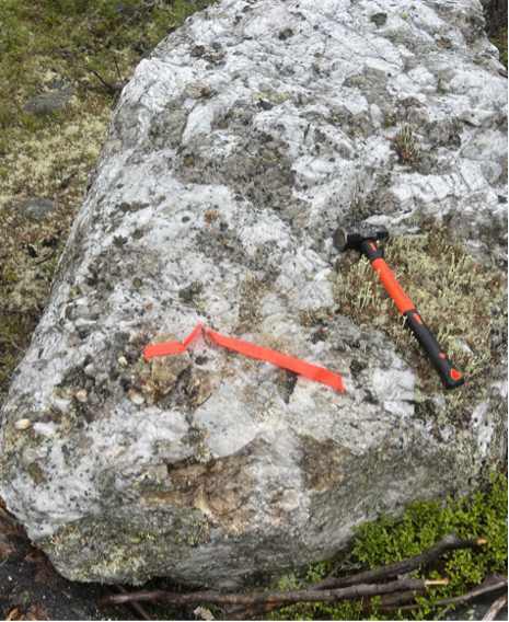 A total of 474 surface rock grab/chip samples were collected over the course of the 2023 prospecting program. In addition to the discovery of the CV14 spodumene pegmatite occurrence (outcrop), a plethora of spodumene mineralized pegmatite boulders were discovered south of the CV5 Spodumene Pegmatite with 29 boulders, dominantly subangular and 1-3 m in size, assaying between 0.49% Li2O to 3.22% Li2O (Figure 4 and Figure5). Interpretation of glacial ice movement over the Property indicates that, although many of these boulders are undoubtedly sourced from the principal CV5 Pegmatite body, a significant number indicate spodumene pegmatite(s) is present near-surface immediately south of CV5, and along strike eastwardly of the principal CV5 pegmatite body towards CV4, where it remains open.