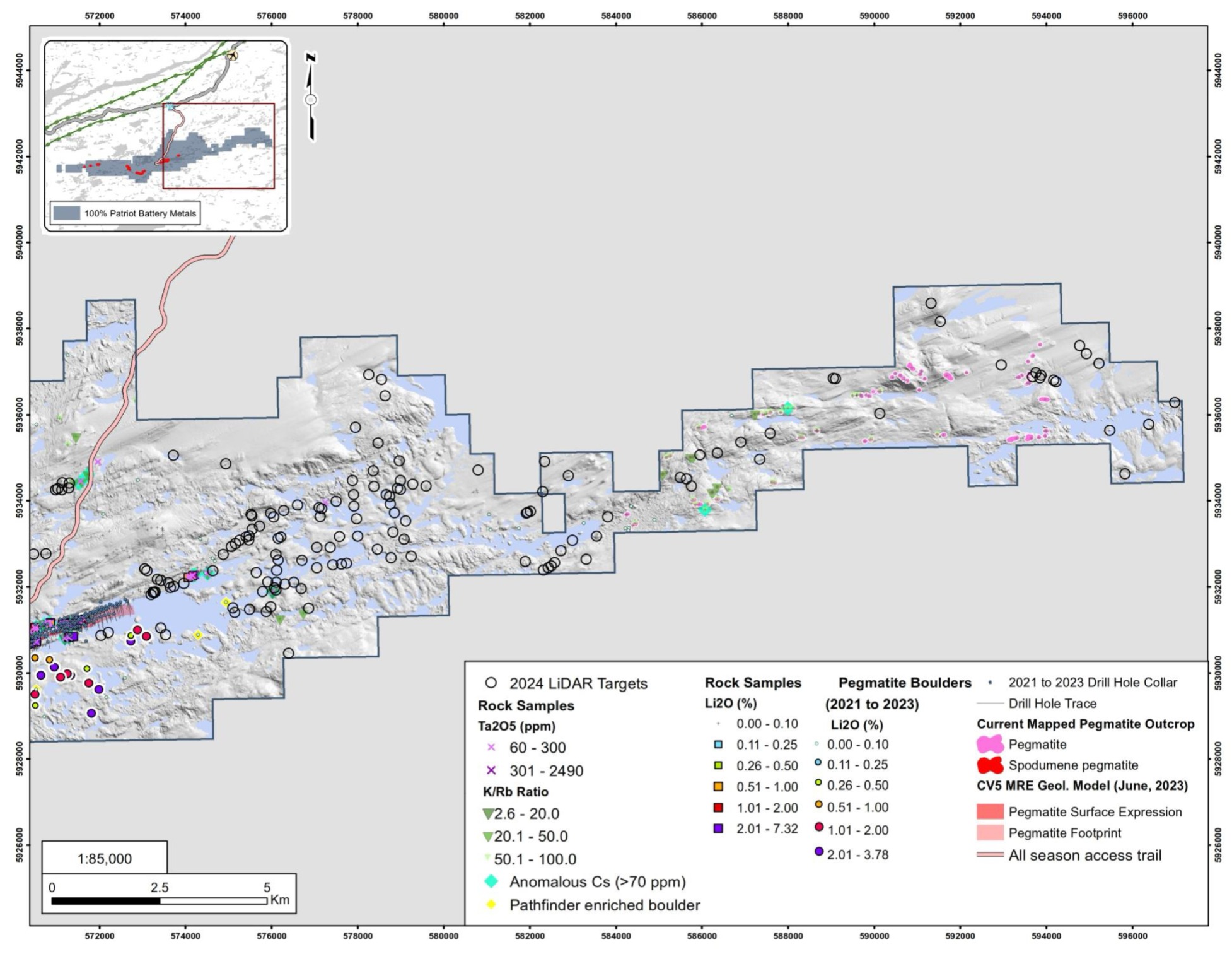 - The 2024 surface exploration program is planned to consist of channel sampling of known LCT pegmatites (including CV14), detailed geological mapping over the CV5 & CV13 spodumene pegmatites, and regional prospecting over unexplored areas of the Property.
