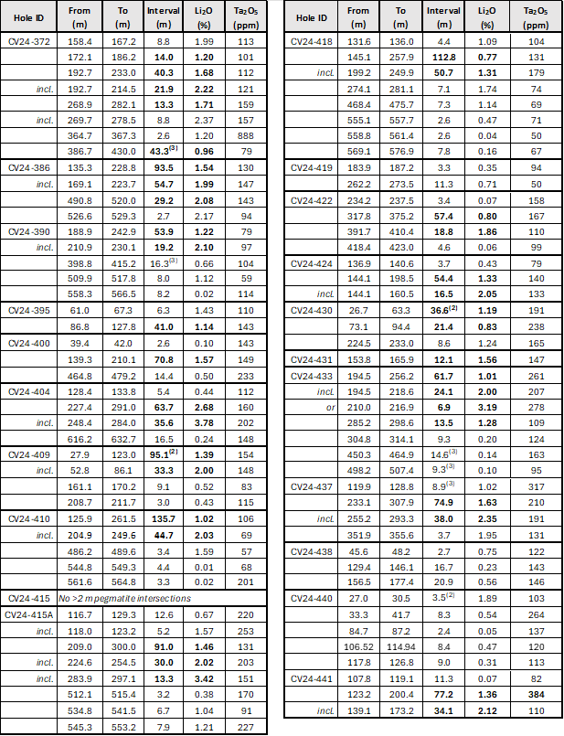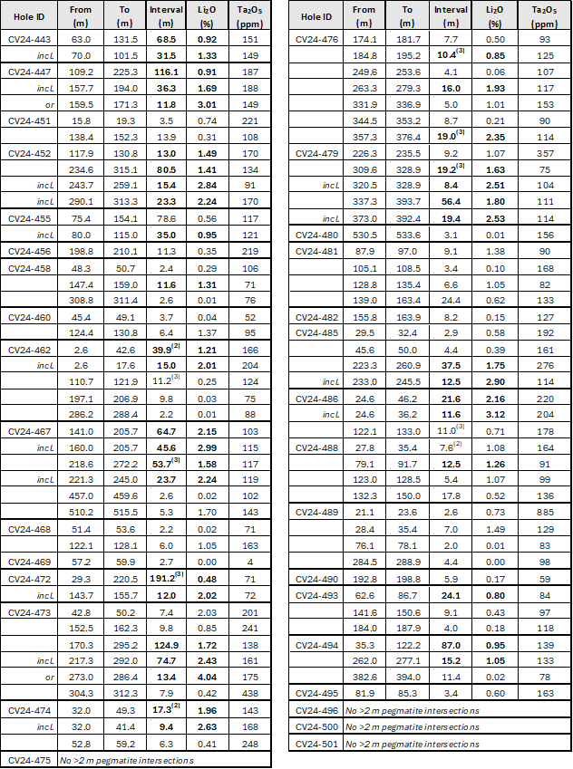 - 135.7 m at 1.02% Li2O, including 44.7 m at 2.03% Li2O (CV24-410).
