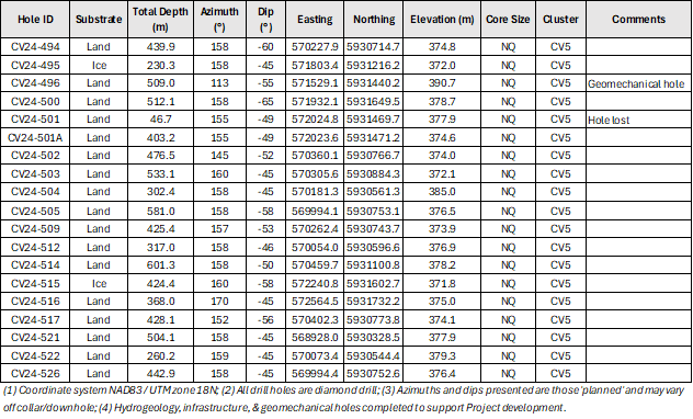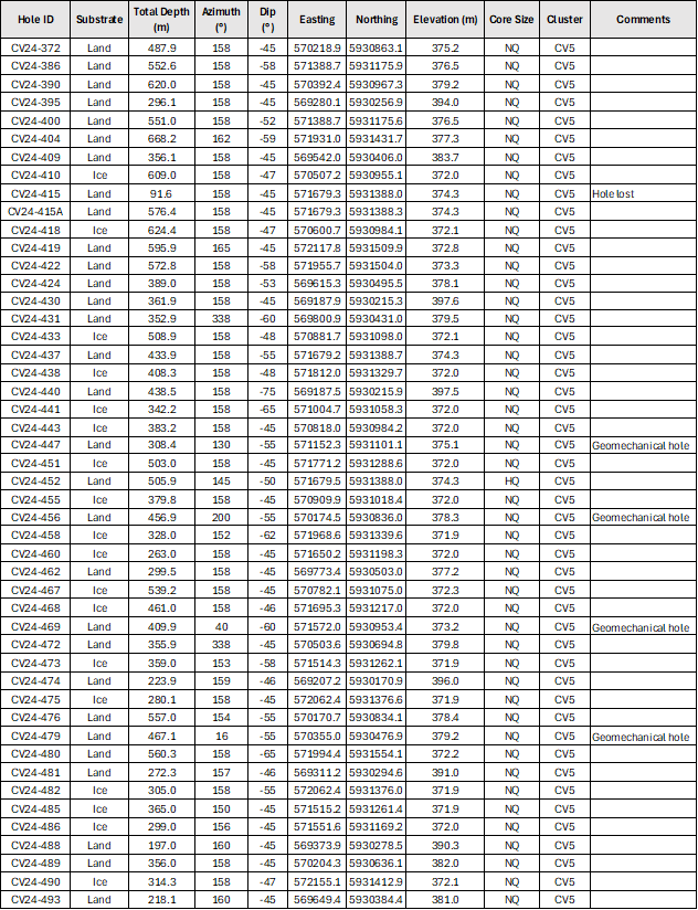 The 2024 winter drill program totaled 62,518 m (166 holes), including 50,961 m (121 holes) at CV5 and 11,557 m (45 holes) at CV13. Core assay results for all drill holes completed at CV5 during the program have now been reported. A total of 4,538 m (16 holes) remain to be reported from CV13 and include multiple step-out drill holes targeting the high-grade Vega Zone (see news release dated June 10, 2024).
