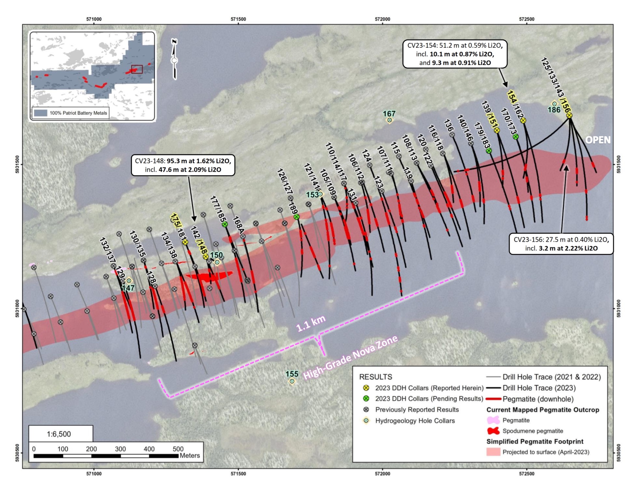 Drill hole CV23-148 targeted the Nova Zone and returned a wide and high-grade intercept of 95.3 m at 1.62% Li2O, including 47.6 m at 2.09% Li2O or 4.1 m at 4.44% Li2O. The high-grade result affirms the interpretation that the Nova Zone extends continuously over a strike length of at least 1.1 km – from drill holes CV23-132 to 108 (Figures 1 and 2).