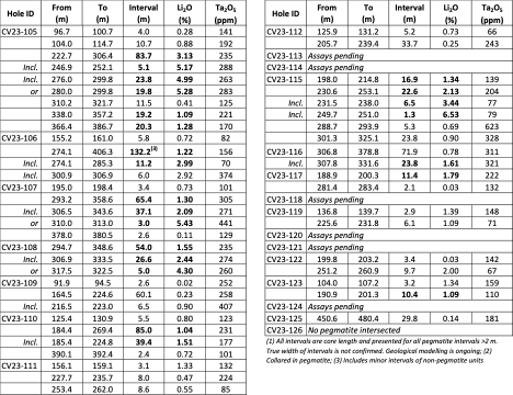 • 83.7 m at 3.13% Li2O (222.7 m to 306.4 m), including 19.8 m at 5.28% Li2O and 5.1 m at 5.17% Li2O (CV23-105).