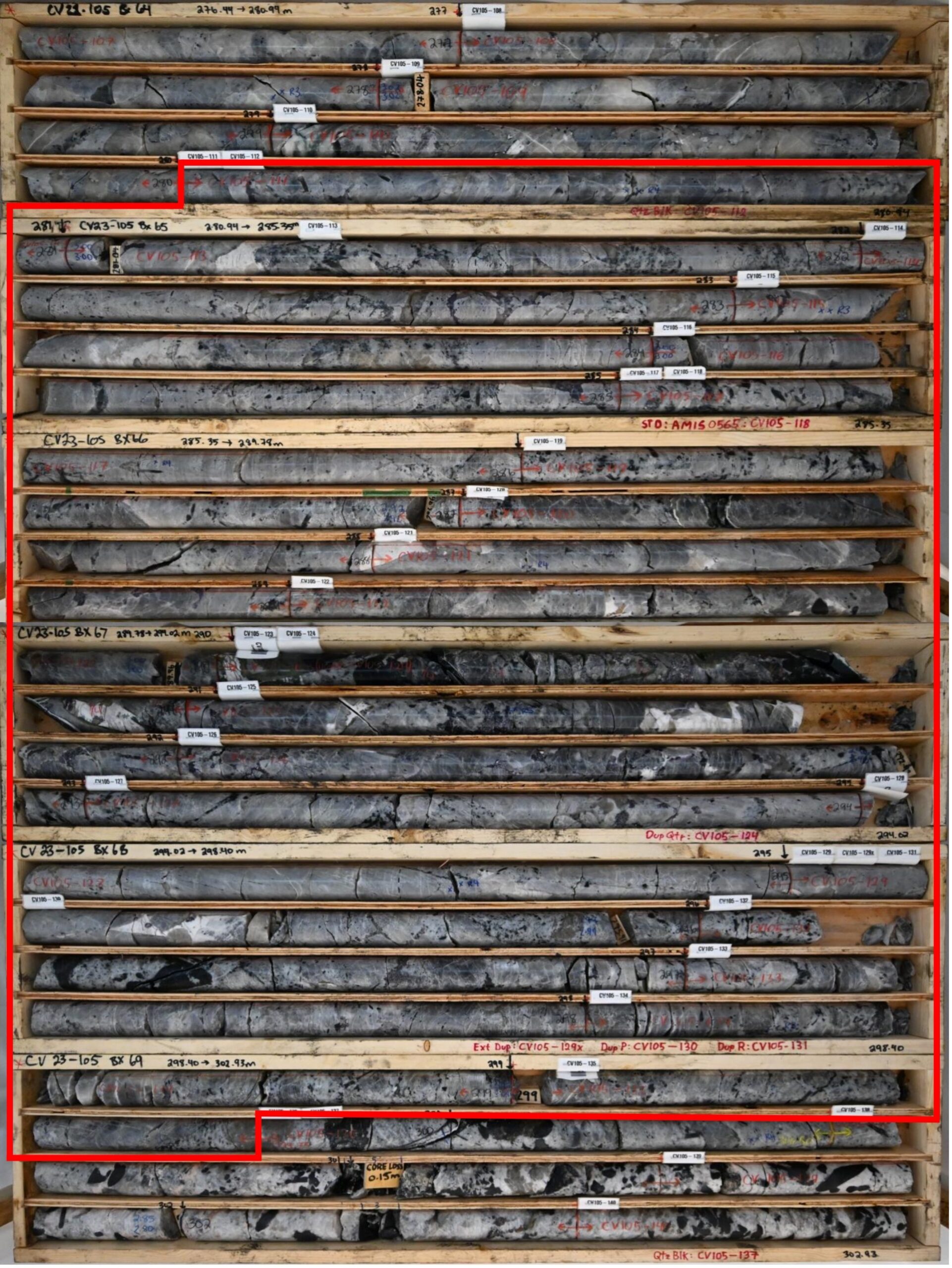 Figure 2: High-grade lithium pegmatite intersection in drill hole CV23-105 – 19.8 m at 5.28% Li2O (red box)