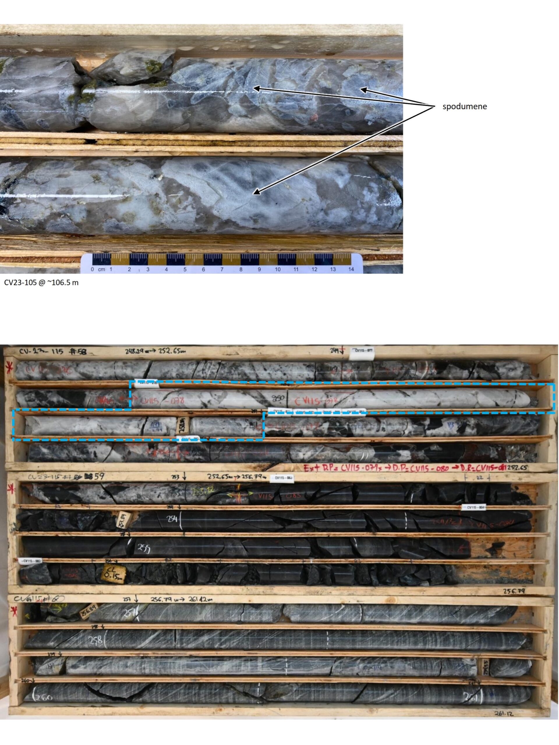 Figure 3: Spodumene in pegmatite from drill hole CV23-105 (top), and high-grade lithium pegmatite intersection in drill hole CV23-115 (bottom) – 1.3 m at 6.53% Li2O (blue box)