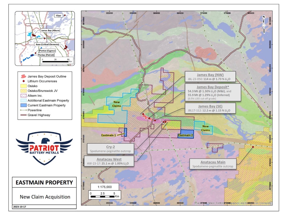 Patriot Battery Metals Inc. (the “Company” or “Patriot”) (TSX-V: PMET) (OTCQB: PMETF) (FSE: R9GA) is pleased to announce that it has increased its land position at its Eastmain Project, located in the Eeyou Istchee James Bay region, Quebec, through the acquisition of a 100% interest in two (2) proximal claim blocks. The new claim blocks total 73 claims (3,851.5 ha) and are located immediately adjacent to Alkem Limited’s James Bay Lithium Project, and on strike of the James Bay Lithium Deposit (Figure 1), within the prospective Eastmain Greenstone Belt.