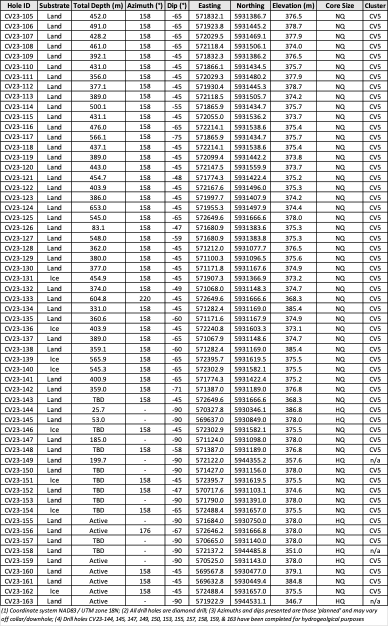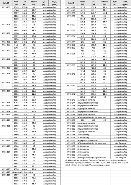 As of March 20, 2023, the Company has completed fifty-two (52) drill holes with another seven (7) actively coring, for a collective total of fifty-nine (59) holes and 21,780 m (CV23-105 to 163). Six (6) of these rigs are active at the CV5 Pegmatite with one (1) rig active at a different area of the Property testing a potential infrastructure location in support of advancing the Pre-Feasibility Study. An update on the status of the Pre-Feasibility programs will be detailed in a forthcoming news release.
