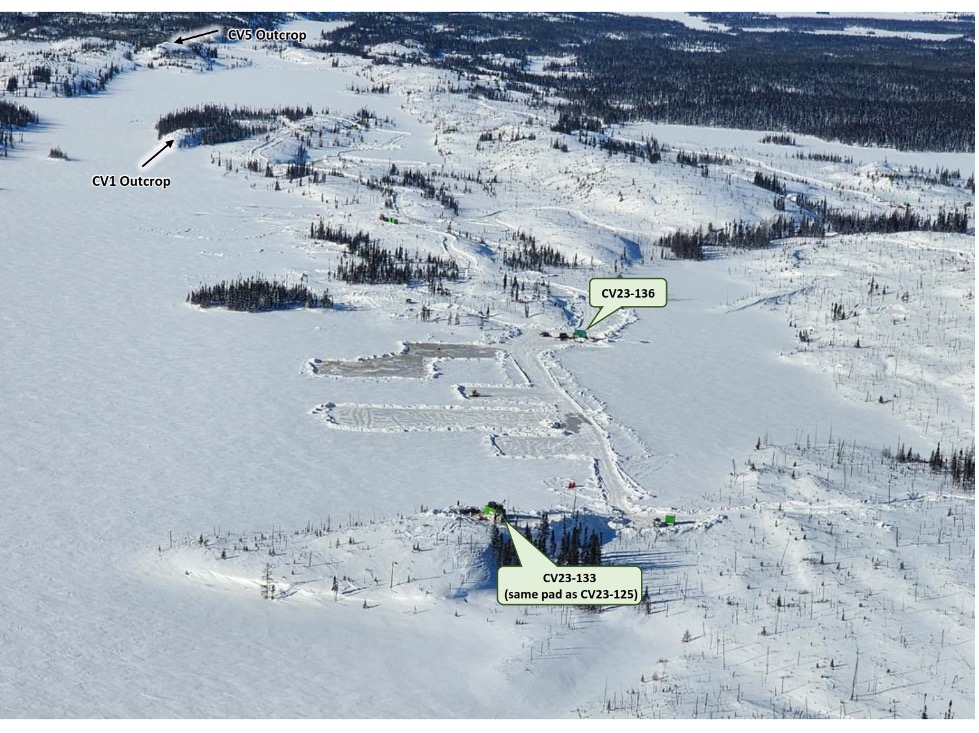 Darren L. Smith, Company Vice President of Exploration, comments: “the CV5 Pegmatite continues to grow, having been now traced continuously over a strike length of 3.15 km, drill hole to drill hole, and remains open at both ends along strike, and at depth along most of its length. Although hindered by an uncharacteristically warm winter period, limiting amenability of ice-based drilling, we have been able to meet and already exceed our winter program objectives in terms of meterage drilled and new spodumene pegmatite discovered. We are now within approximately 1.5 km of the CV4 Pegmatite cluster to the east and have just begun to step-out westwardly towards the CV13 Pegmatite cluster.