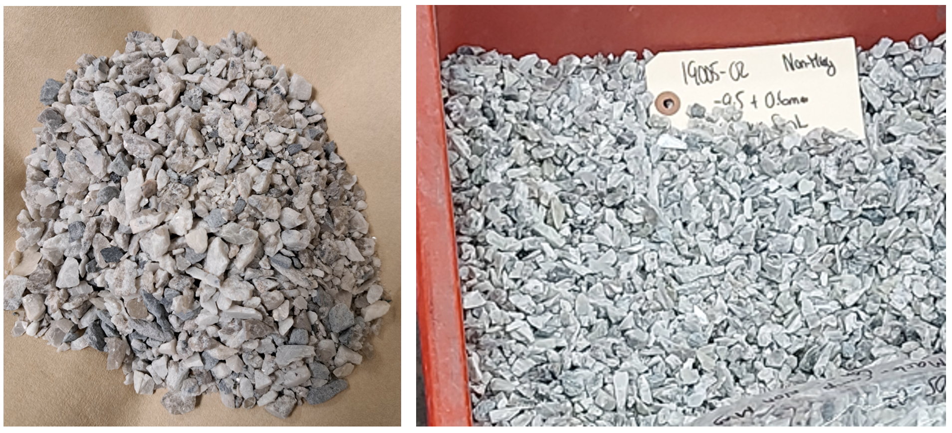 Figure 2: Crushed whole rock pegmatite with 15% non-pegmatite host rock dilution – 1.05% Li2O (left); DMS spodumene concentrate feed for the downstream test work – 6.2% Li2O and 0.60% Fe2O3 (right).