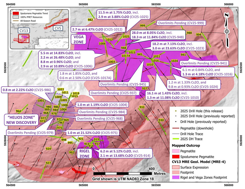 Core assay results for caesium for 8,596 m (52 holes) at the CV13 Pegmatite are reported in this announcement, including prior pending overlimit[3] analysis (see Figure 1, Table 1, Table 2, Table 3). Core assay results for caesium for 1,176 m (7 holes), covering the Vega and Helios zones, remain to be reported. Results for lithium and tantalum for all drill holes completed in 2025 at Shaakichiuwaanaan were previously reported (see news releases dated December 14, 2025 and January 21, 2026). All reported widths are core length (i.e., apparent and not true width).