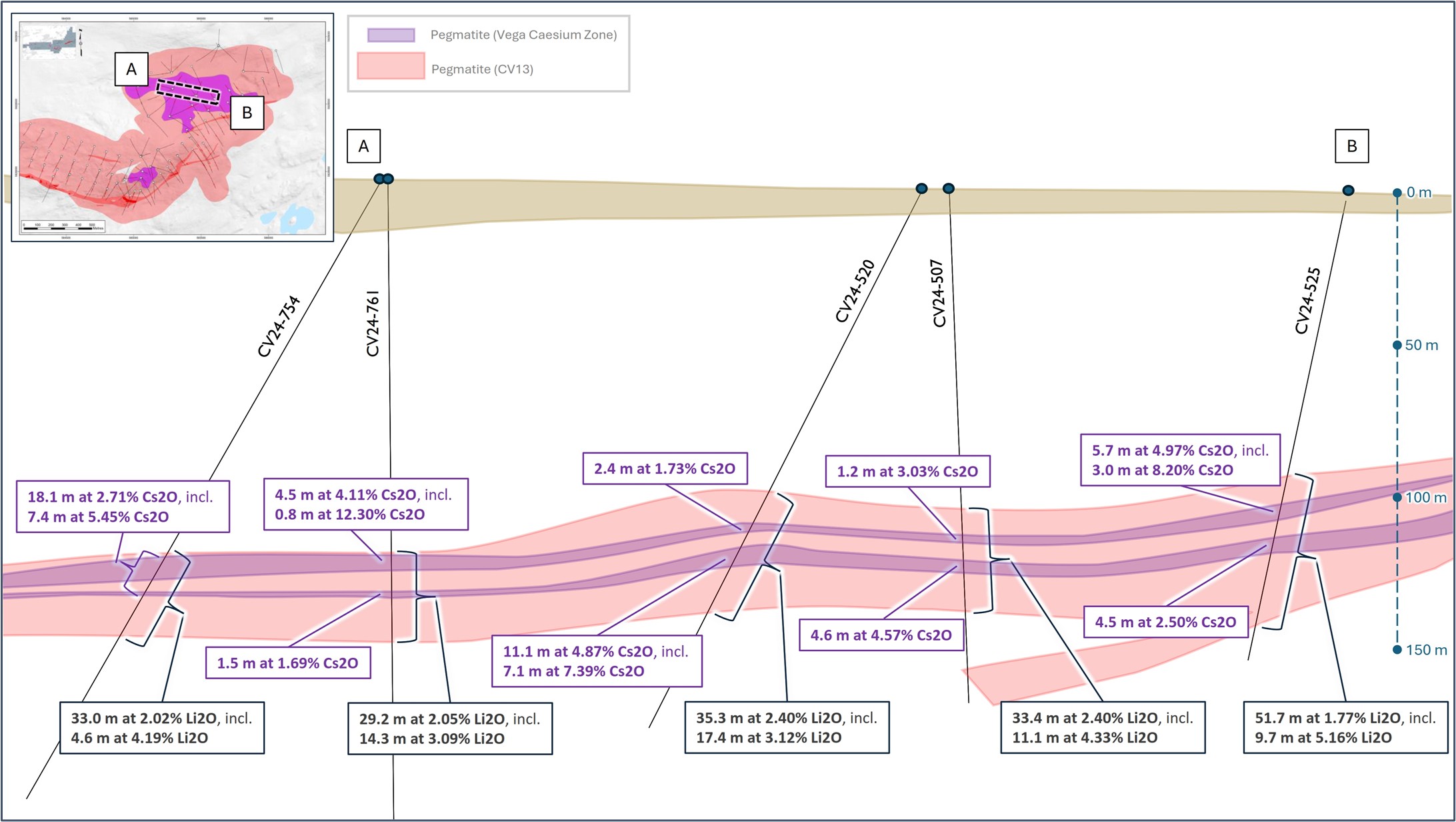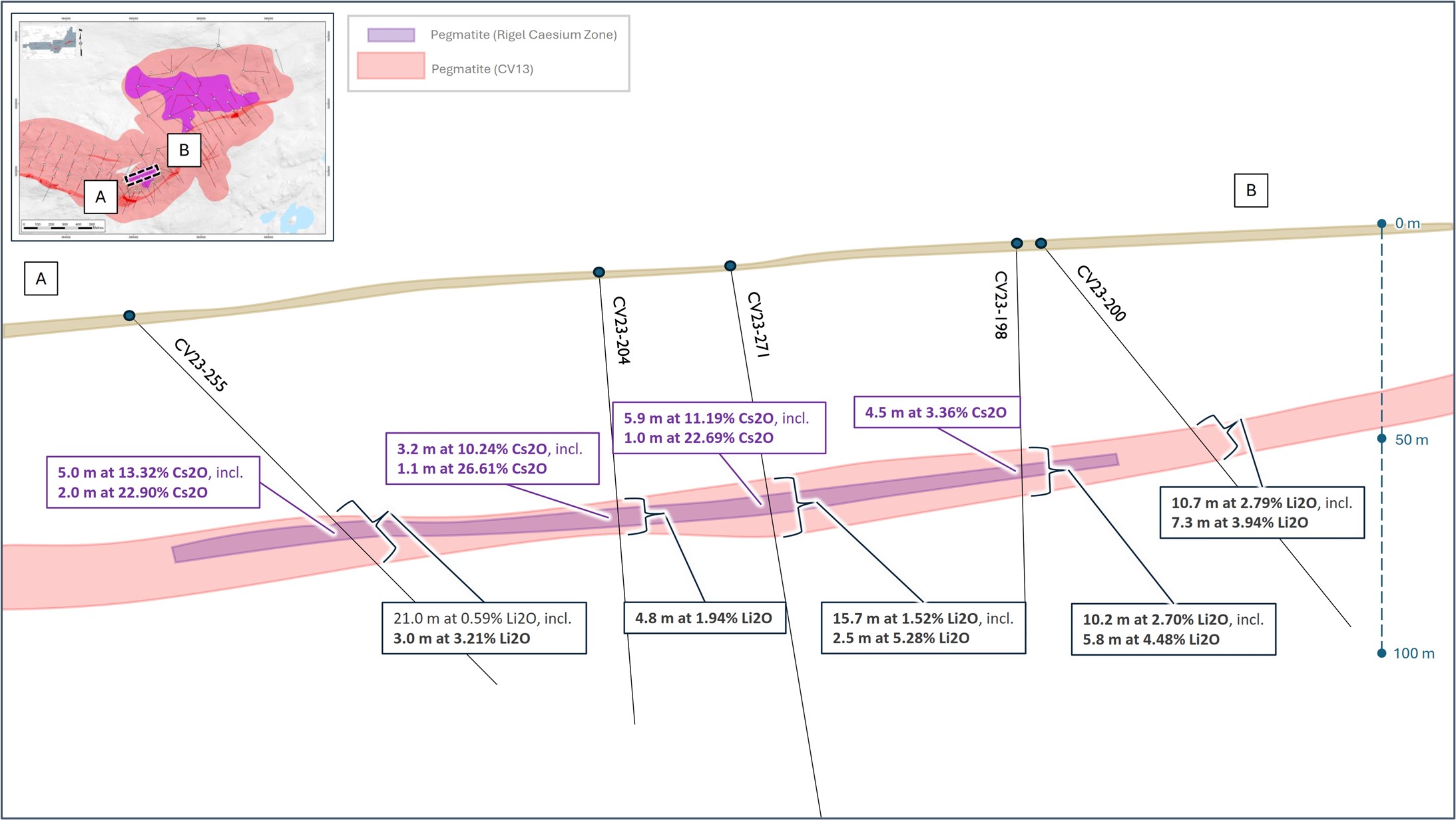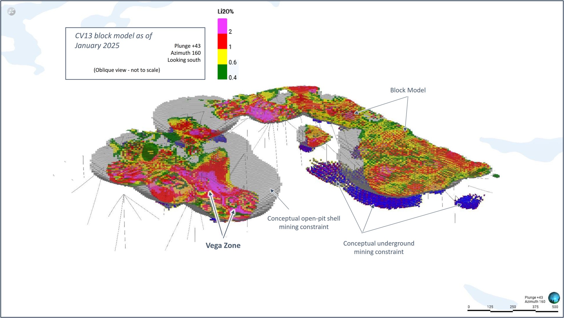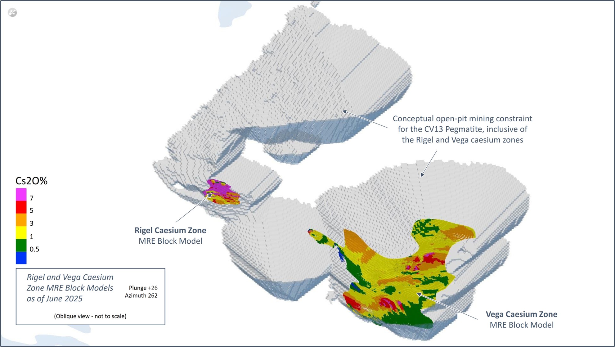 [9] The Consolidated MRE cut-off grade is variable depending on the mining method and pegmatite (0.40% Li2O open-pit, 0.60% Li2O underground CV5, and 0.70% Li2O underground CV13). A grade constraint of 0.50% Cs2O was used to model the Rigel and Vega caesium zones, which are entirely within the CV13 Pegmatite’s open-pit mining shape. The Effective Date of the MREs is June 20, 2025 (through drill hole CV24-787). Mineral Resources are not Mineral or Ore Reserves as they do not have demonstrated economic viability.