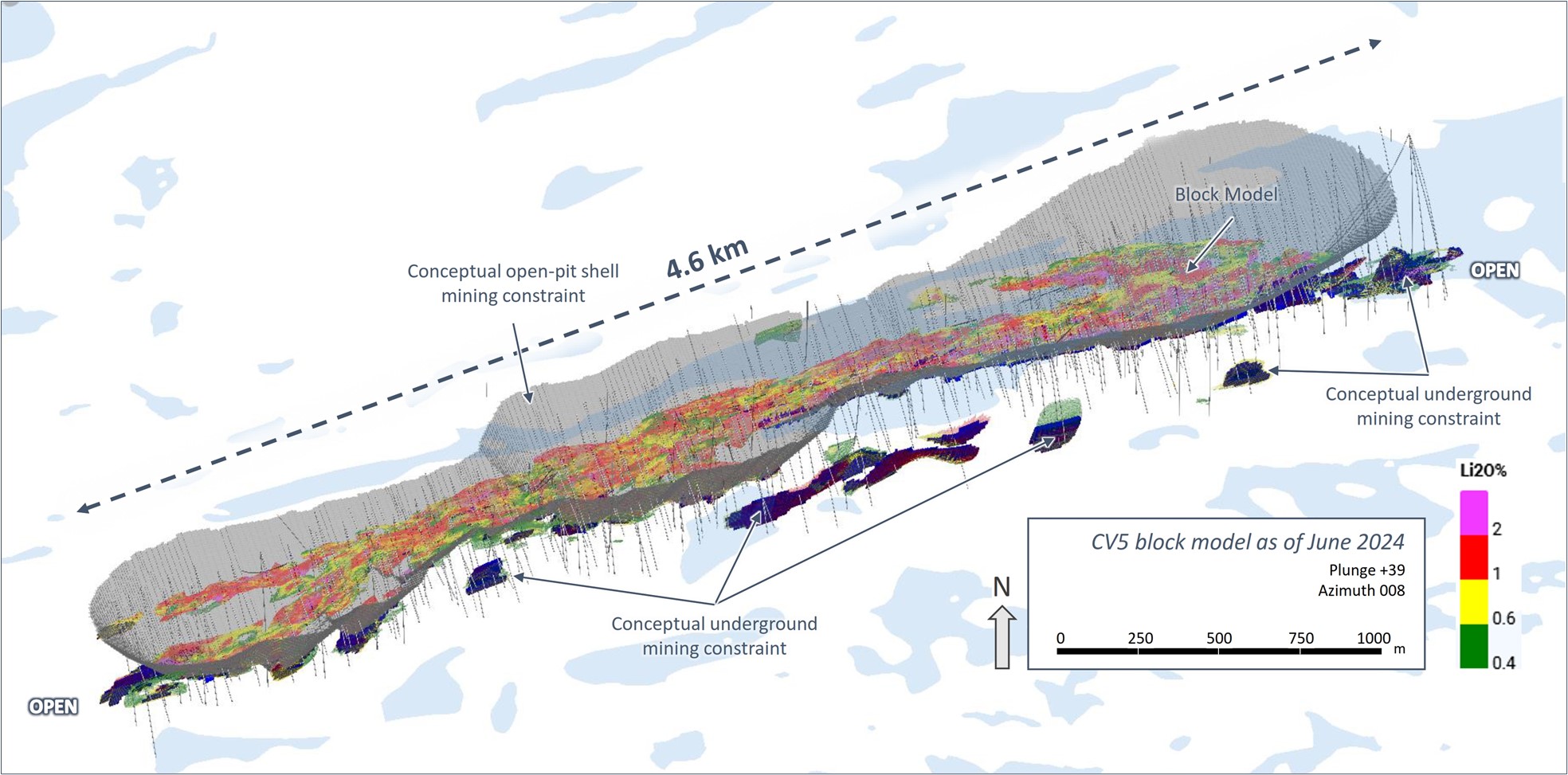 - Both underground and open-pit conceptual mining shapes were applied as constraints to the Consolidated MRE Statement to demonstrate reasonable prospects for eventual economic extraction. Cut-off grades for open-pit constrained resources are 0.40% Li2O for both CV5 and CV13, and for underground constrained resources are 0.60% Li2O for CV5 and 0.70% Li2O for CV13. Open-pit and underground Mineral Resource constraints are based on a long-term average spodumene concentrate price of US$1,500/tonne (6% basis FOB Bécancour) and an exchange rate of 0.70 USD/CAD.