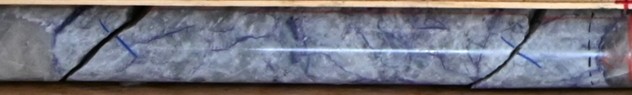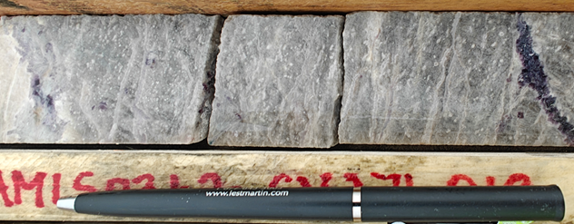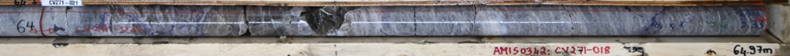 Figure 3: Pollucite mineralization in high-grade caesium drill intersection at ~64.5 m depth in drill hole CV23-271 at the Rigel Zone, CV13 Pegmatite. Interval grades[5] 22.69% Cs2O over 1.0 m (64.0 m to 65.0 m) with XRD-Rietveld reporting a pollucite content over the interval of 58%.