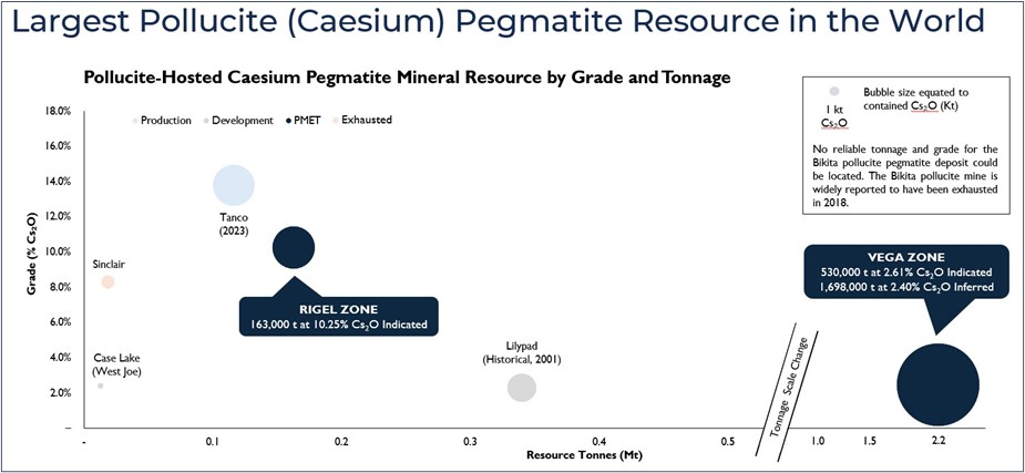 Figure 2: Tonnage vs grade chart highlighting Rigel and Vega caesium zones as the largest pollucite-hosted caesium pegmatite Mineral Resource in the world. Mineral Resource data sourced through July 11, 2025, from corporate disclosure. Deposit/Project data presented includes the total caesium zone resource tonnage. Mineral Resources are presented on a 100% basis. Data is presented for all documented in-situ pollucite-hosted caesium pegmatite deposits/projects to the knowledge of the Company. See Appendix 2 for further details and supporting information.