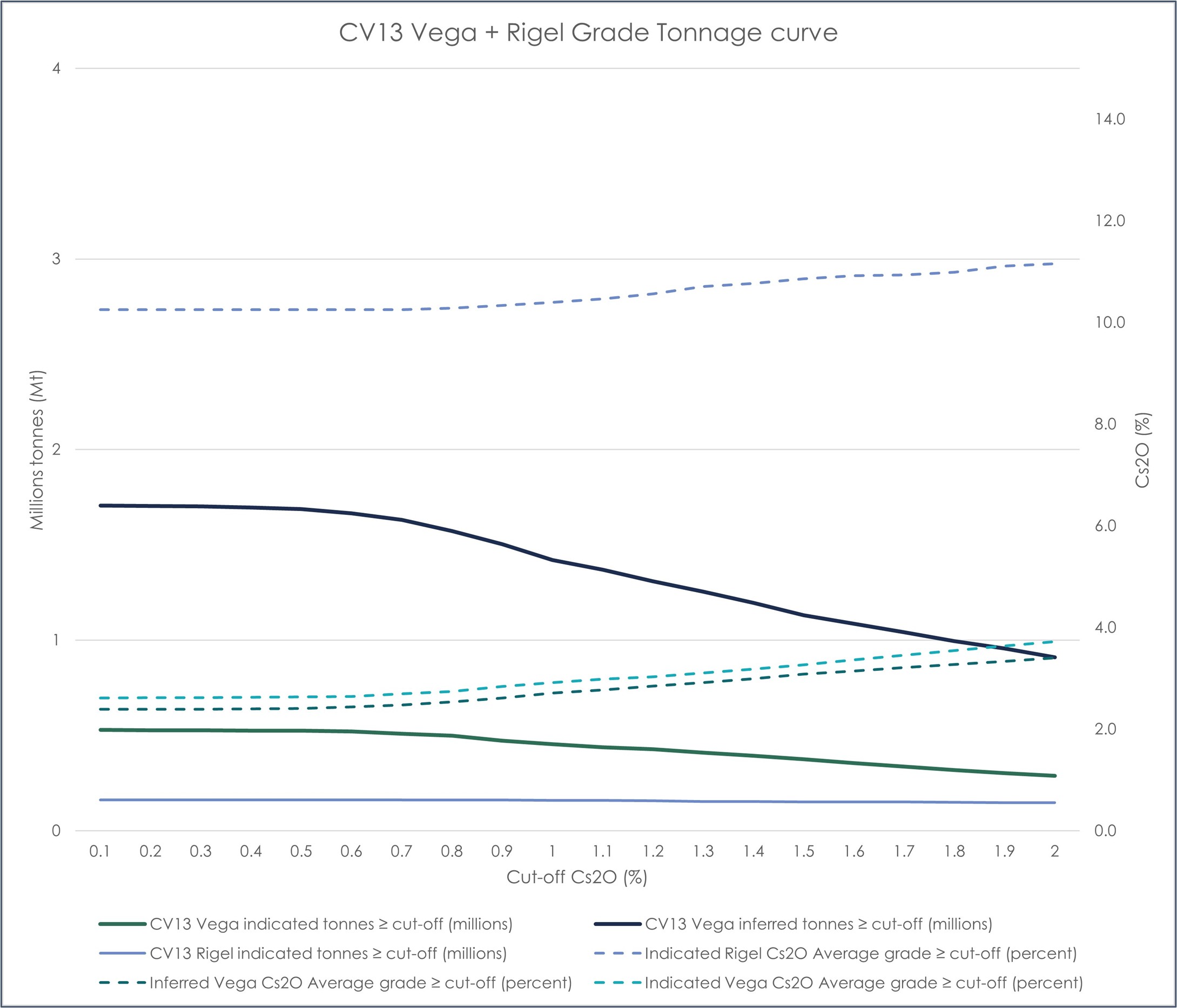 Figure 4: Grade-tonnage curves for the Rigel and Vega Caesium Zone MREs at the CV13 Pegmatite.