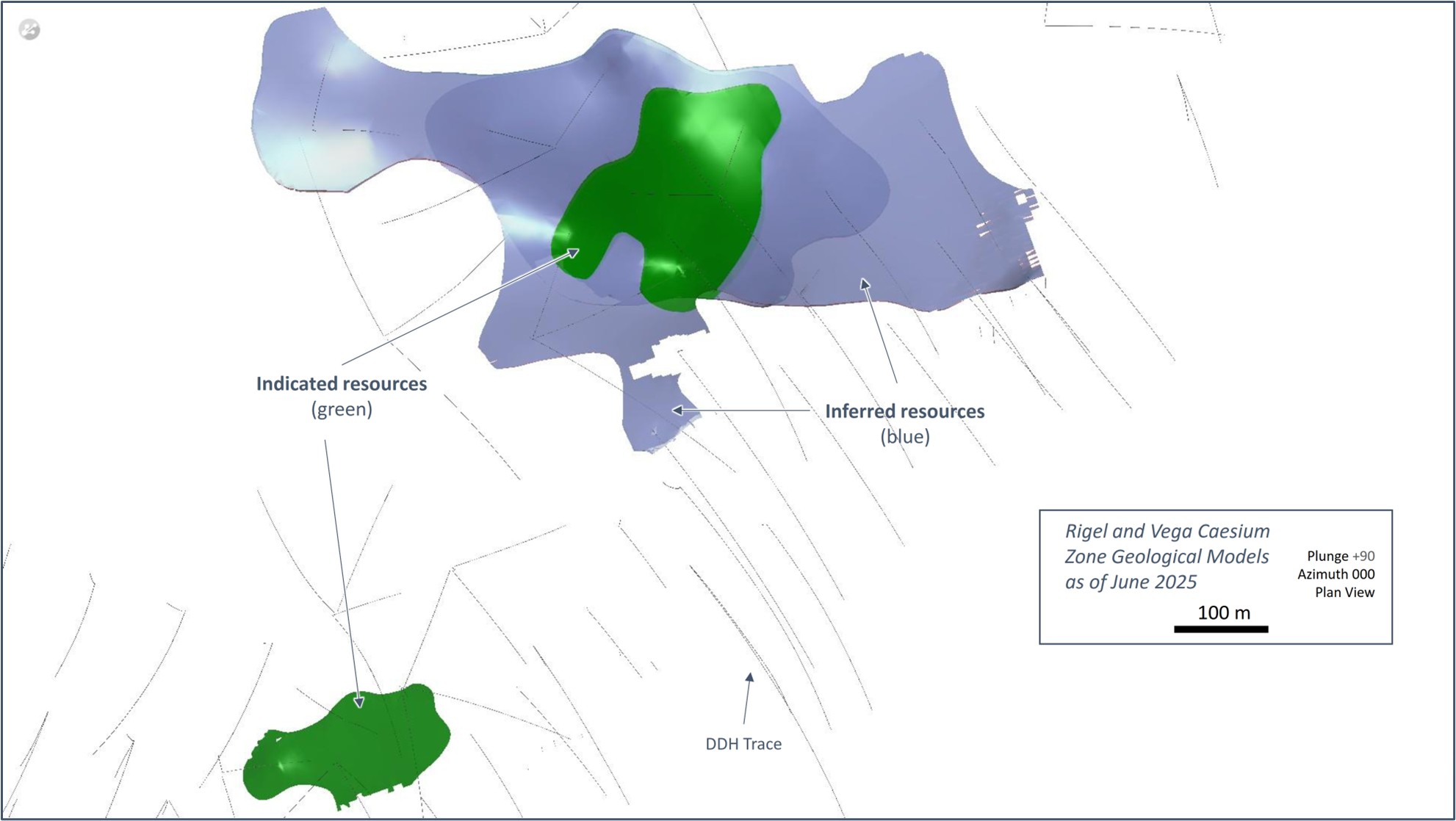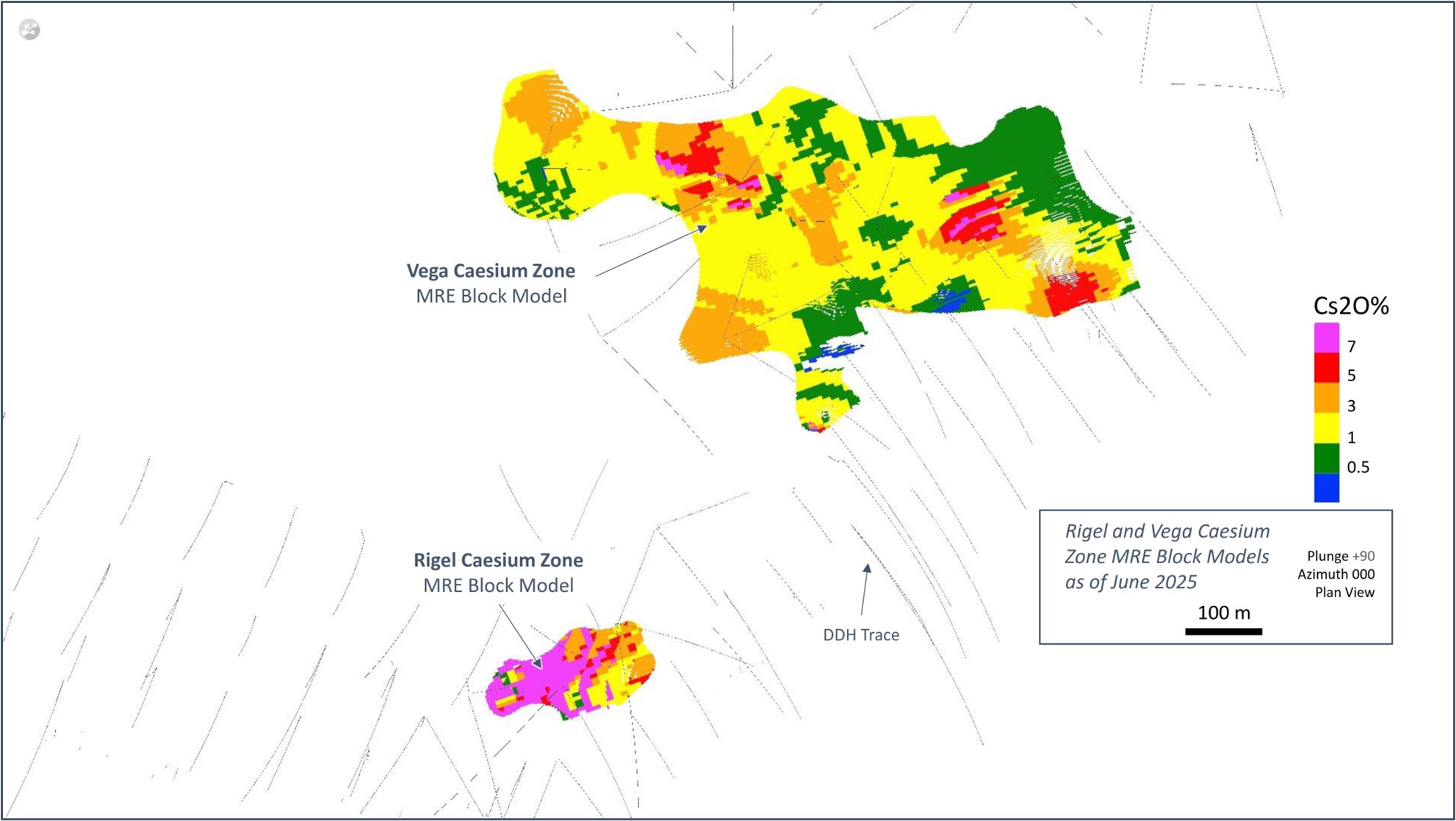 Using the 0.5% Cs2O grade constraint, the footprint of caesium mineralization at Rigel has been traced over a general area of at least 200 m x 100 m and consists of a single, shallow dipping lens at a depth of ~50 m with a true thickness of <2 m to ~6 m. At the Vega Zone, the footprint of the caesium mineralization has been traced over a general area of at least 800 m x 250 m and consists of two proximal flat-lying lenses, at a depth of ~110 m, with a true thickness of <2 m and up to ~10 m and ~6 m, respectively