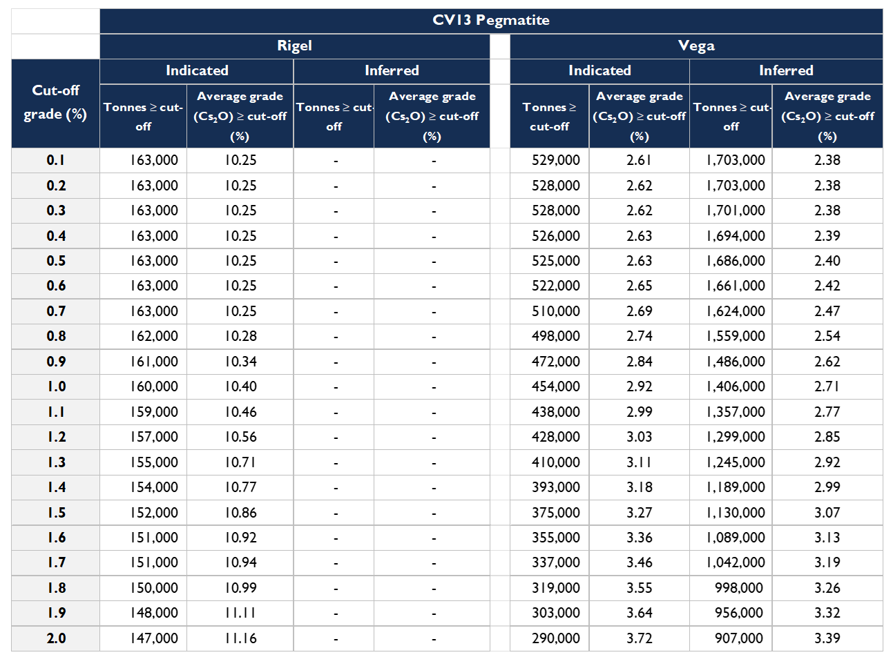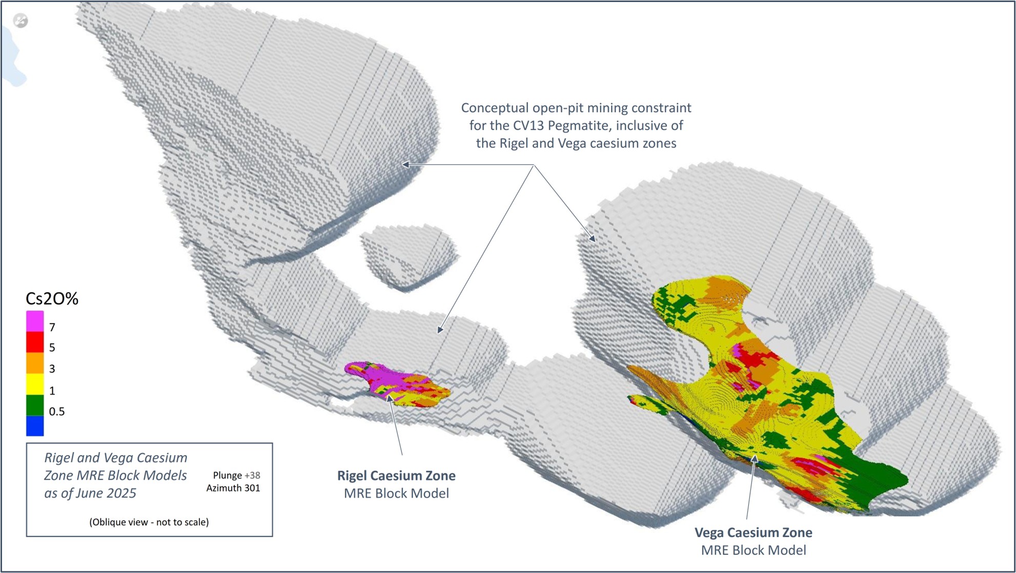 - Mineral Resources for the Rigel and Vega zones are hosted within the CV13 Pegmatite’s open-pit conceptual mining shape and, therefore, are included within the Consolidated Mineral Resource Statement for CV5 and CV13 pegmatites. The Rigel and Vega zones were interpreted using a 0.50% Cs2O grade constraint based on mineral processing analogues and mineralogical analysis supporting pollucite as the predominant Cs-bearing mineral present.