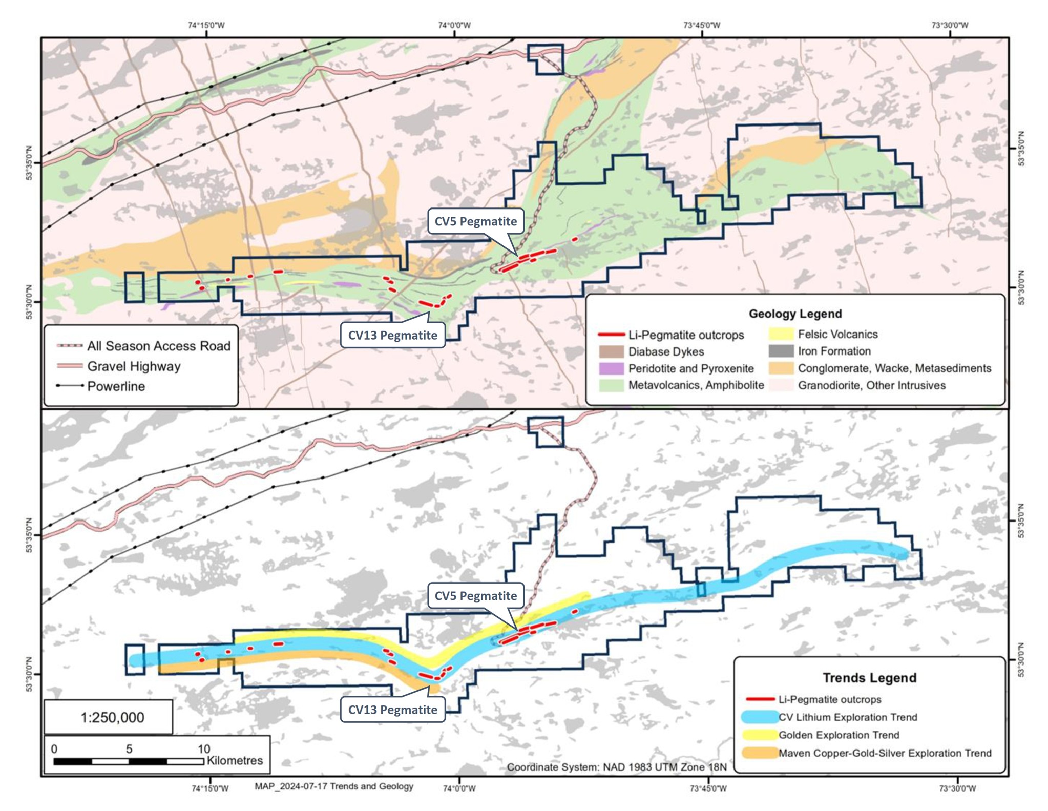 | Geology | · Deposit type, geological setting and style of mineralization. | · The Property overlies a large portion of the Lac Guyer Greenstone Belt, considered part of the larger La Grande River Greenstone Belt and is dominated by volcanic rocks metamorphosed to amphibolite facies. The claim block is dominantly host to rocks of the Guyer Group (amphibolite, iron formation, intermediate to mafic volcanics, peridotite, pyroxenite, komatiite, as well as felsic volcanics). The amphibolite rocks that trend east-west (generally steeply south dipping) through this region are bordered to the north by the Magin Formation (conglomerate and wacke) and to the south by an assemblage of tonalite, granodiorite, and diorite, in addition to metasediments of the Marbot Group (conglomerate, wacke). Several regional-scale Proterozoic gabbroic dykes also cut through portions of the Property (Lac Spirt Dykes, Senneterre Dykes).· The geological setting is prospective for gold, silver, base metals, platinum group elements, and lithium over several different deposit styles including orogenic gold (Au), volcanogenic massive sulfide (Cu, Au, Ag), komatiite-ultramafic (Au, Ag, PGE, Ni, Cu, Co), and pegmatite (Li, Cs, Ta).