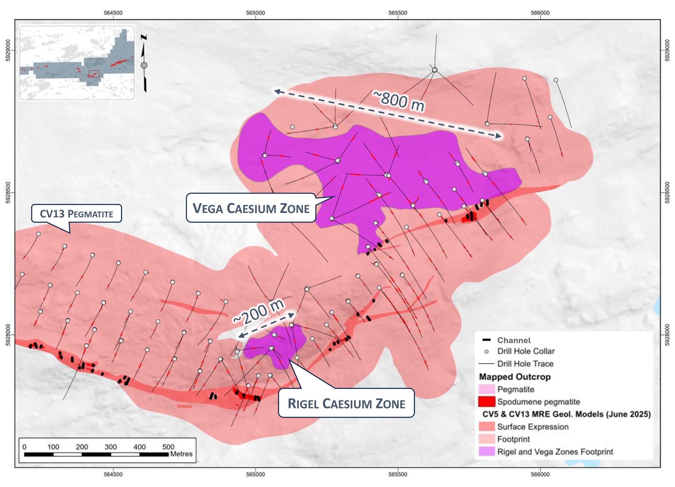 [2] The Consolidated MRE cut-off grade is variable depending on the mining method and pegmatite (0.40% Li2O open-pit, 0.60% Li2O underground CV5, and 0.70% Li2O underground CV13). A grade constraint of 0.50% Cs2O was used to model the Rigel and Vega caesium zones, which are entirely within the CV13 Pegmatite’s open-pit mining shape. The Effective Date of the MREs is June 20, 2025 (through drill hole CV24-787). Mineral Resources are not Mineral or Ore Reserves as they do not have demonstrated economic viability.