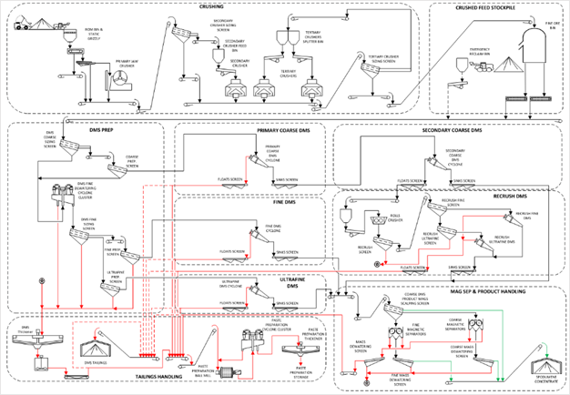 - The conceptual processing flowsheet includes a crushing plant, followed by a DMS-only processing plant, and finally dewatering